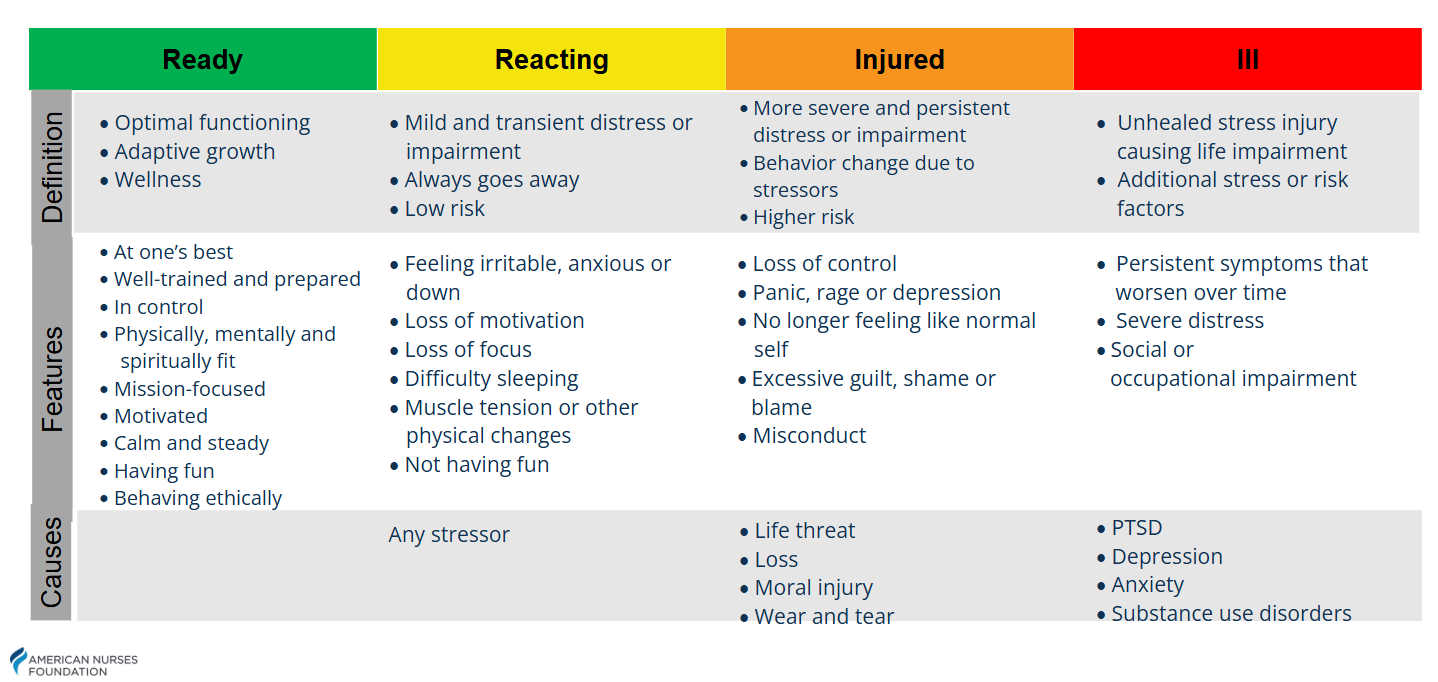 Stress First Aid builds on the Stress Continuum model, a simple color-coded spectrum originally designed by the military: